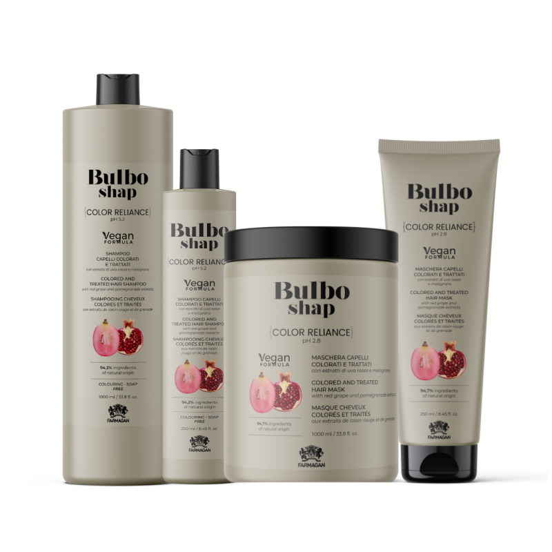 De Bulbo Shap Color Reliance-lijn is speciaal ontwikkeld voor gekleurd en chemisch behandeld haar. Met extracten van rode druif en granaatappel en formules die voor 94,7% uit ingrediënten van natuurlijke oorsprong bestaan, beschermt en voedt deze lijn het haar intensief. Het resultaat: langdurige kleurbescherming, verbeterde glans en een zijdezachte finish.